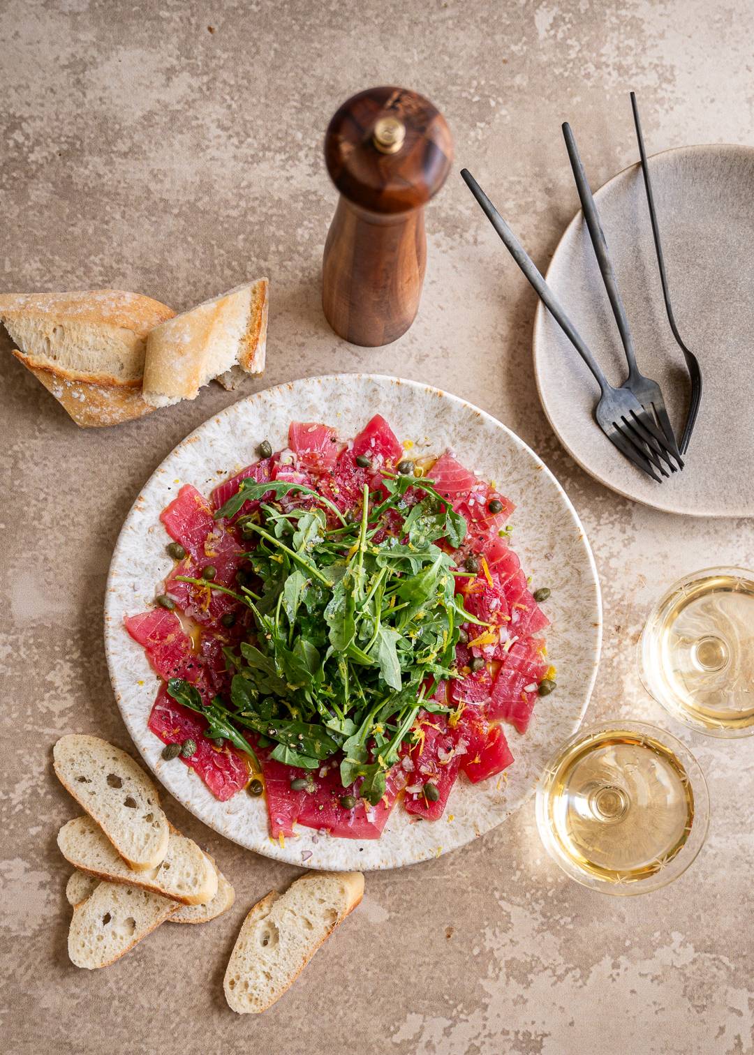 Light, fresh, and elegant — thin-sliced ahi tuna dressed with lemon, olive oil, arugula, capers, and served with baguette slices. This is the ultimate effortless starter that looks impressive with almost no work.