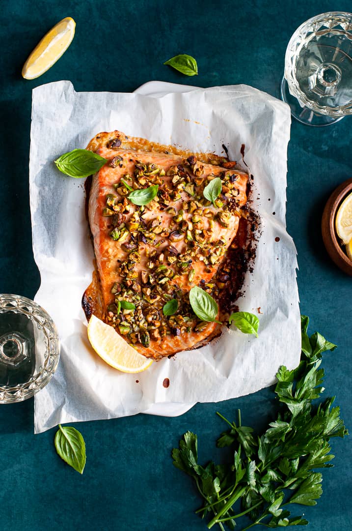 A show-stopper salmon recipe with a crunchy pistachio topping that feels elegant and festive — perfect as the final main dish for the evening.